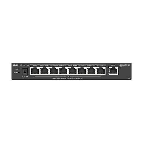 RG-EG109G-P推荐1000Mbps出口带宽,带载100个终端;RG-EG109G-P整机共有9个10/100/1000M自适应网口,其中1个固化WAN口, 8个固化LAN口,并有4个支持802.3af/at标准PoE端口,单端口最大输出30W,整机最大输出78W;RG-EG109G-P具有天生多网段,可制定丰富的上网行为管理策略。
